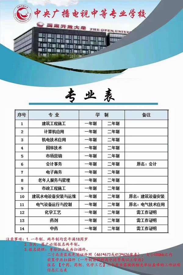 其次电大专业部分专业名称有所调整,如:原会计专业更名为会计事务专业。原建筑设备安装更名为建筑水电设备安装与运维。原电气技术应用专业更名为电气设备运行与控制。另外如果报名中药、药剂、化学工艺这三个专业的,需要提供在职工作证明,报名注册学籍时一并上传到注册系统里。